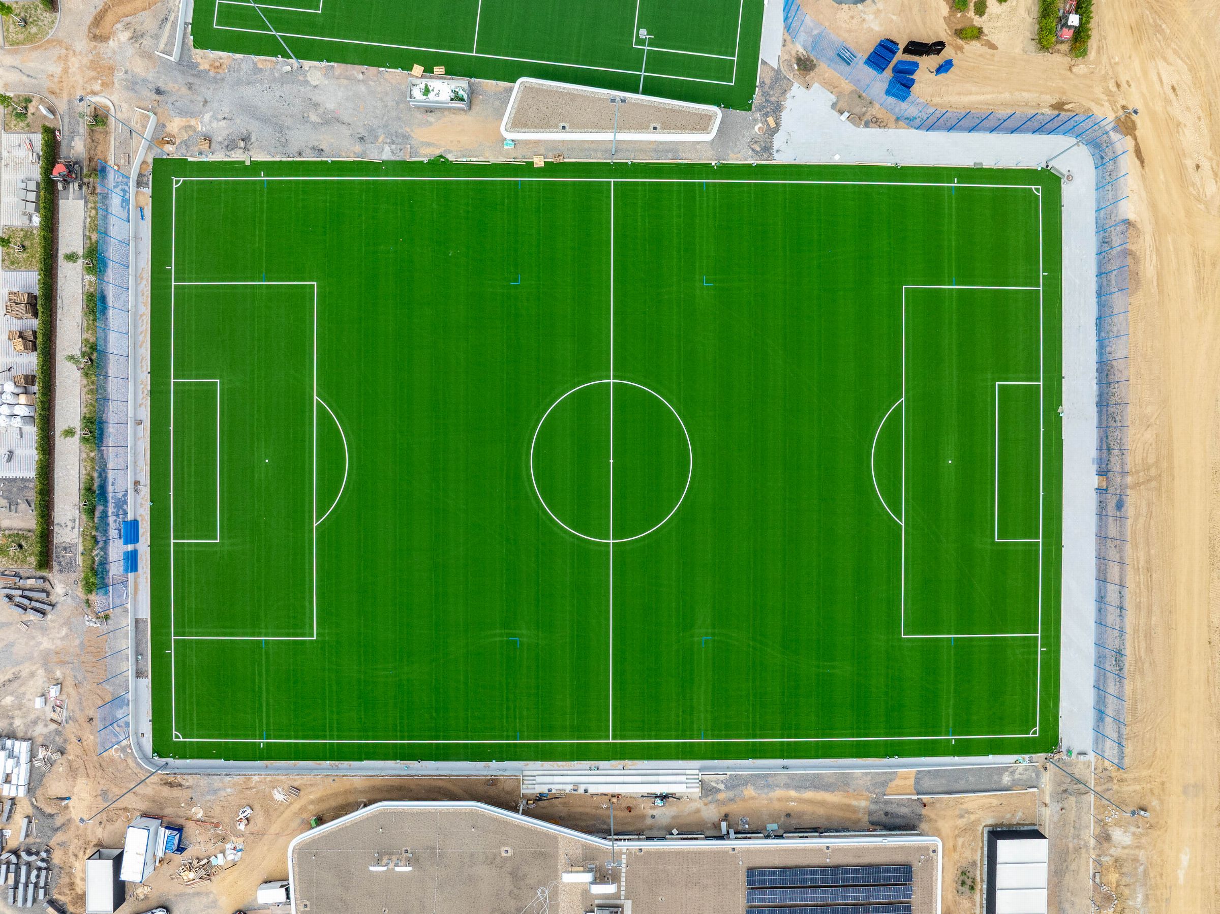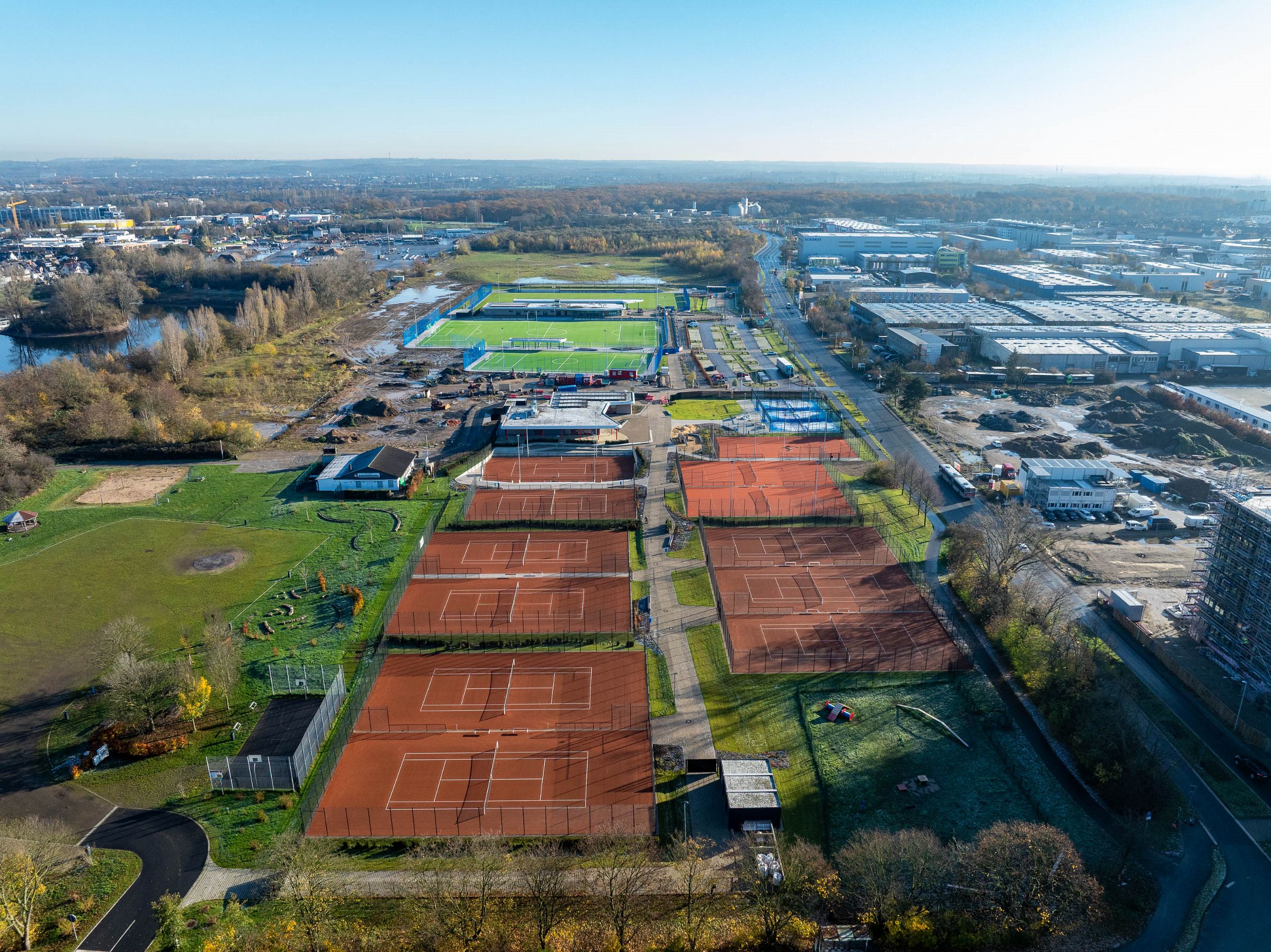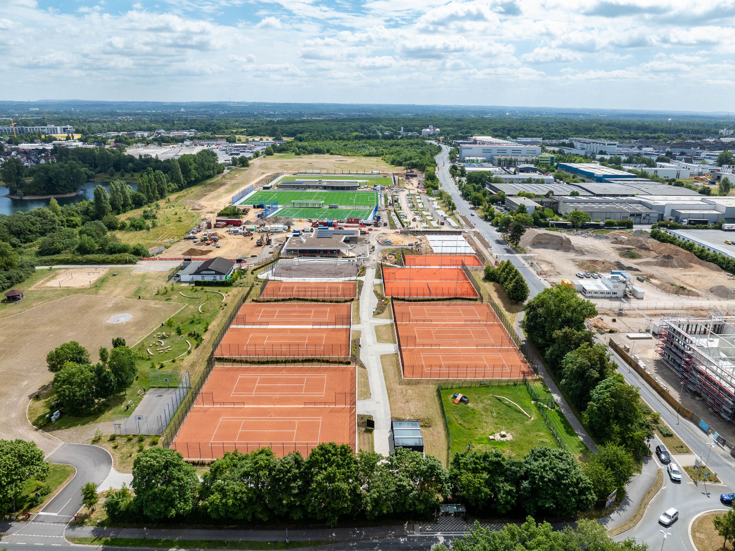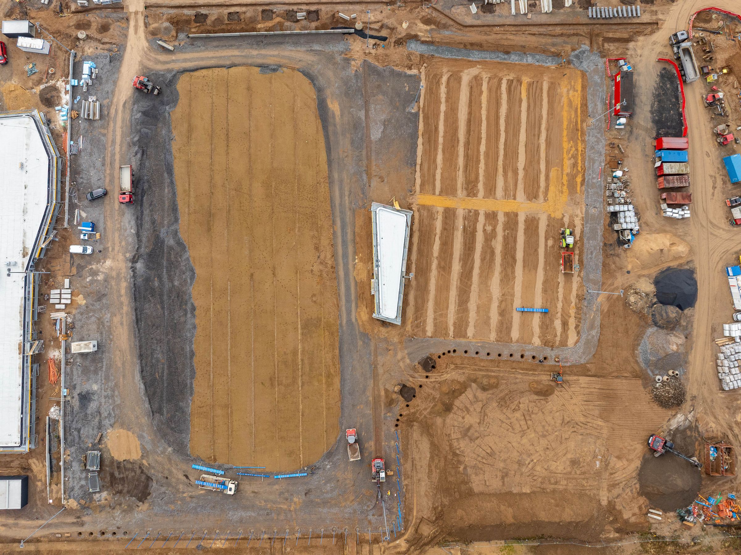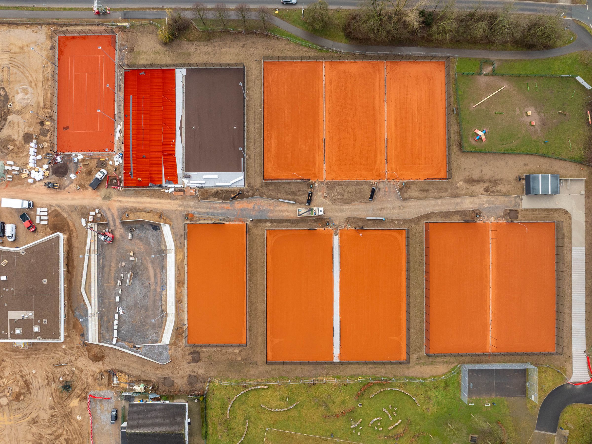 Monatliche Baudokumentation mit der Drohne für den Neubau einer großen Sportfläche für Tennis- und Fußballfelder.