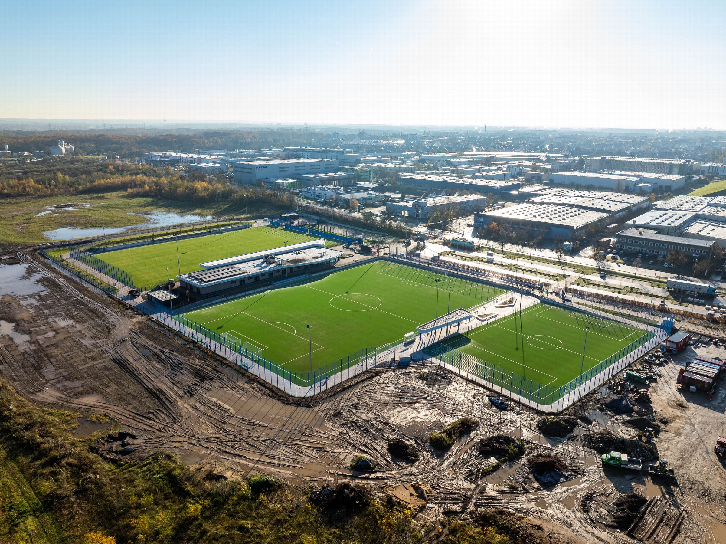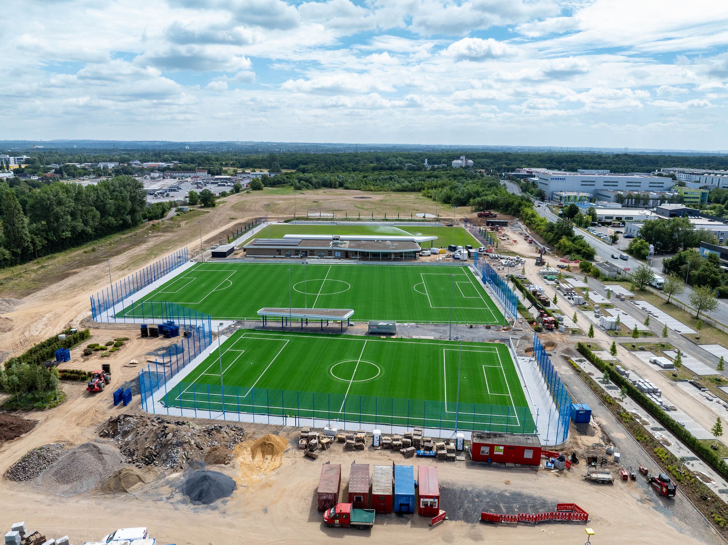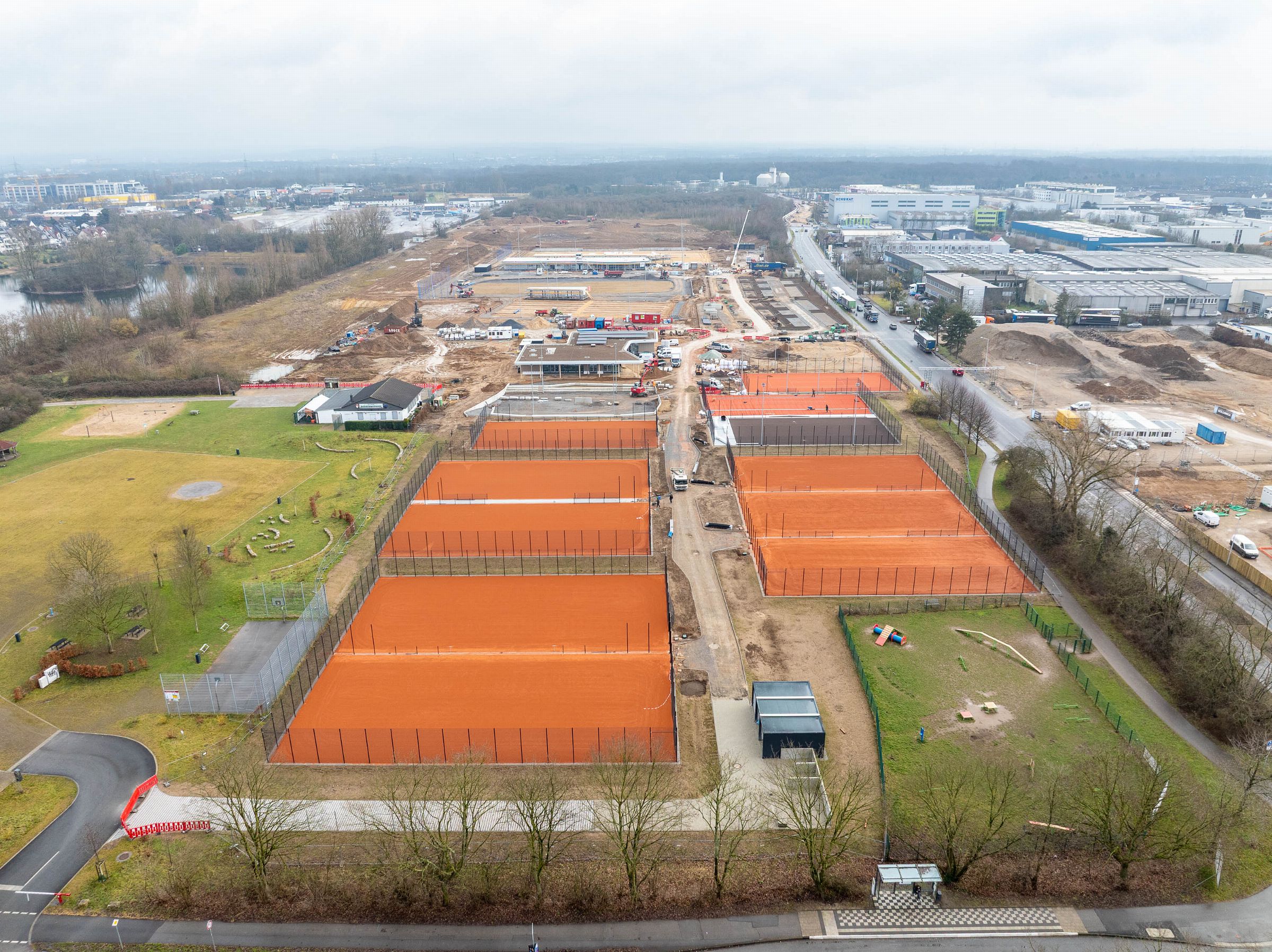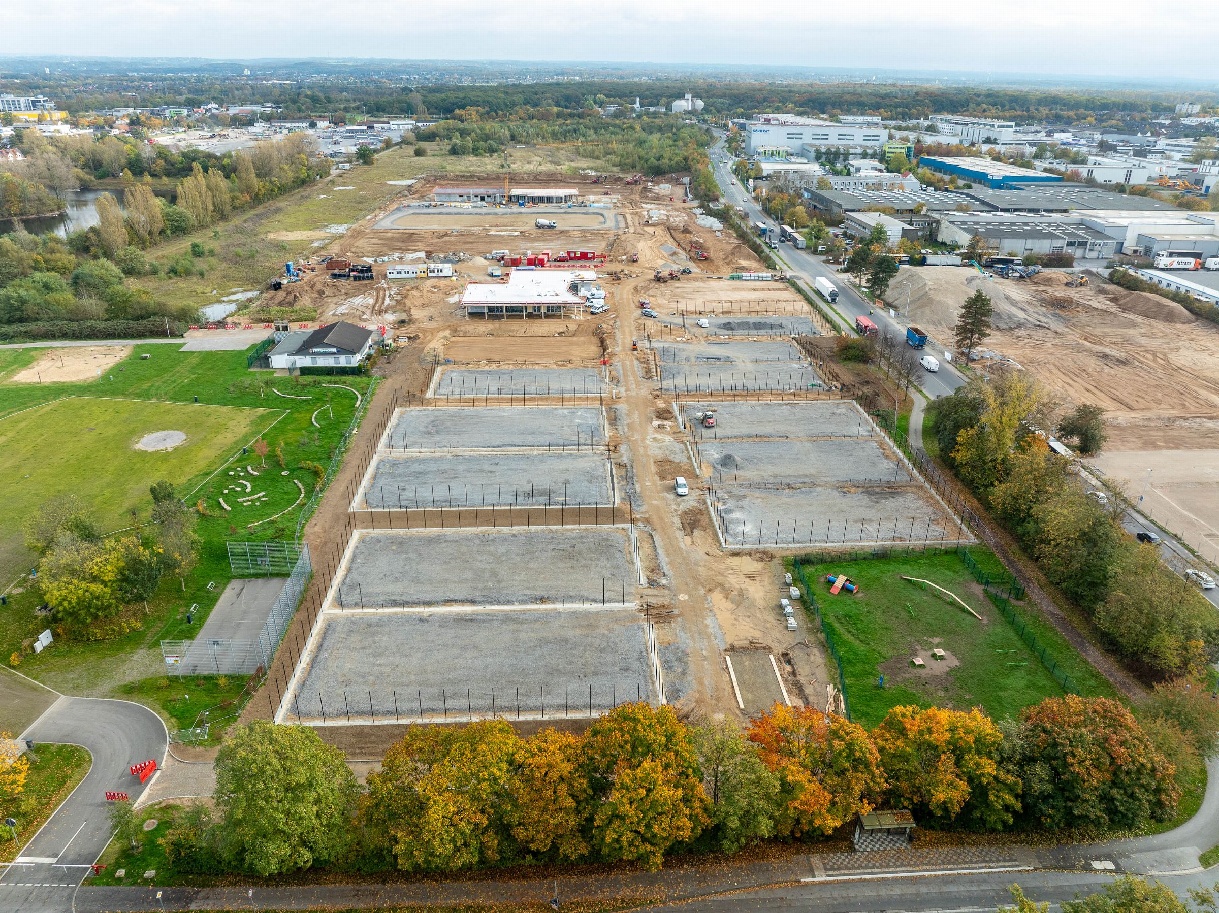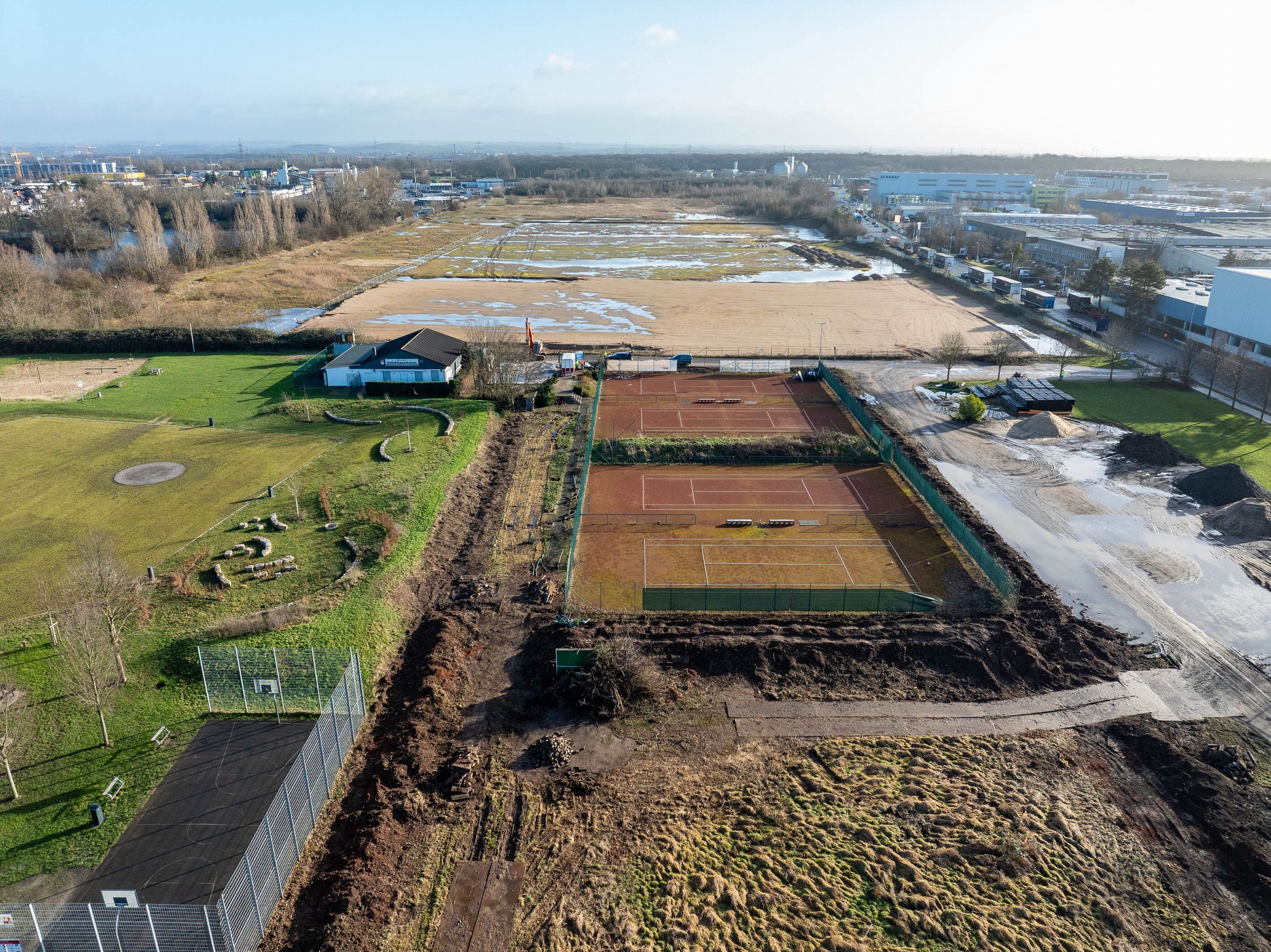 Monatliche Baudokumentation mit der Drohne für den Neubau einer großen Sportfläche für Tennis- und Fußballfelder.