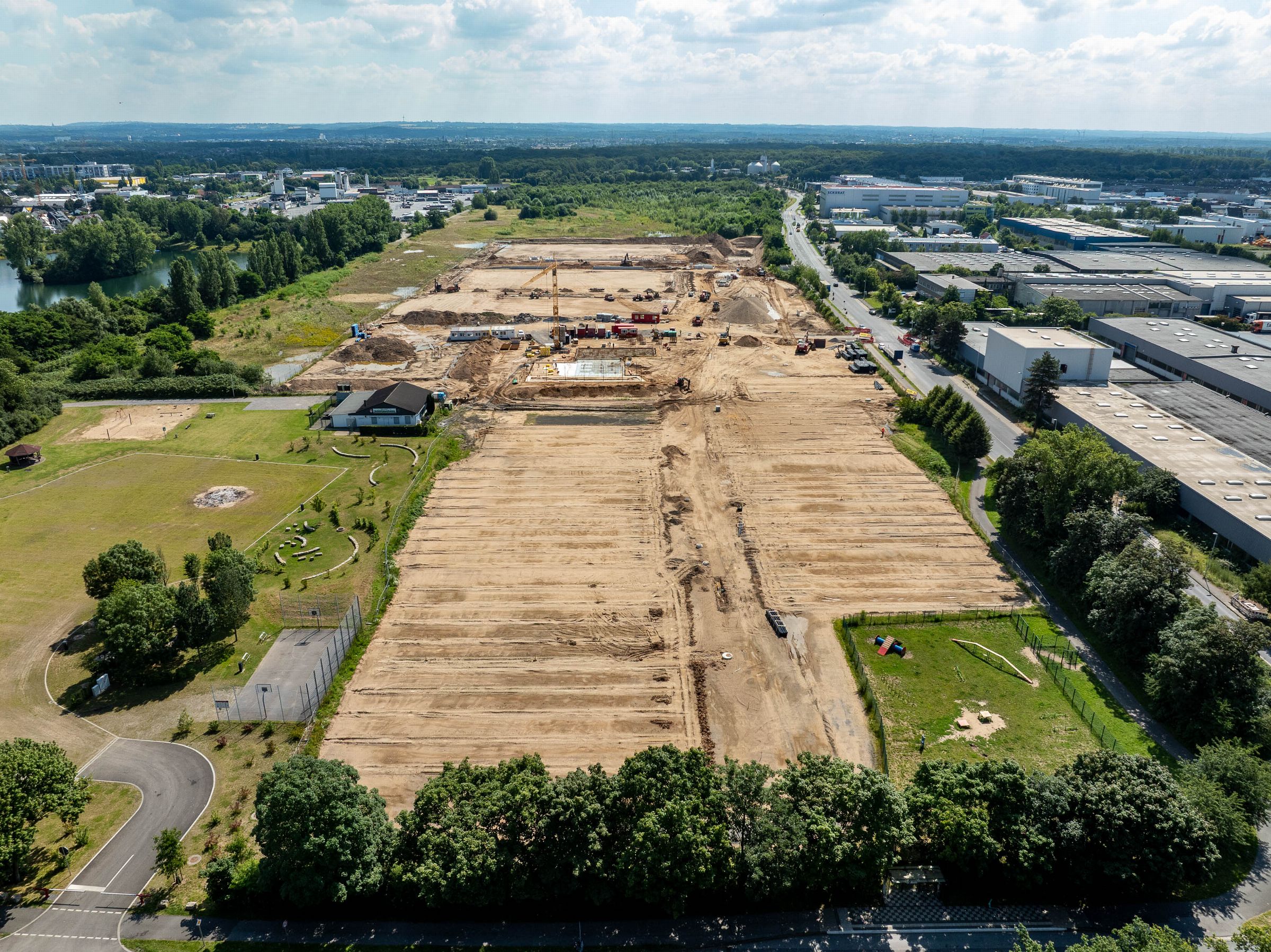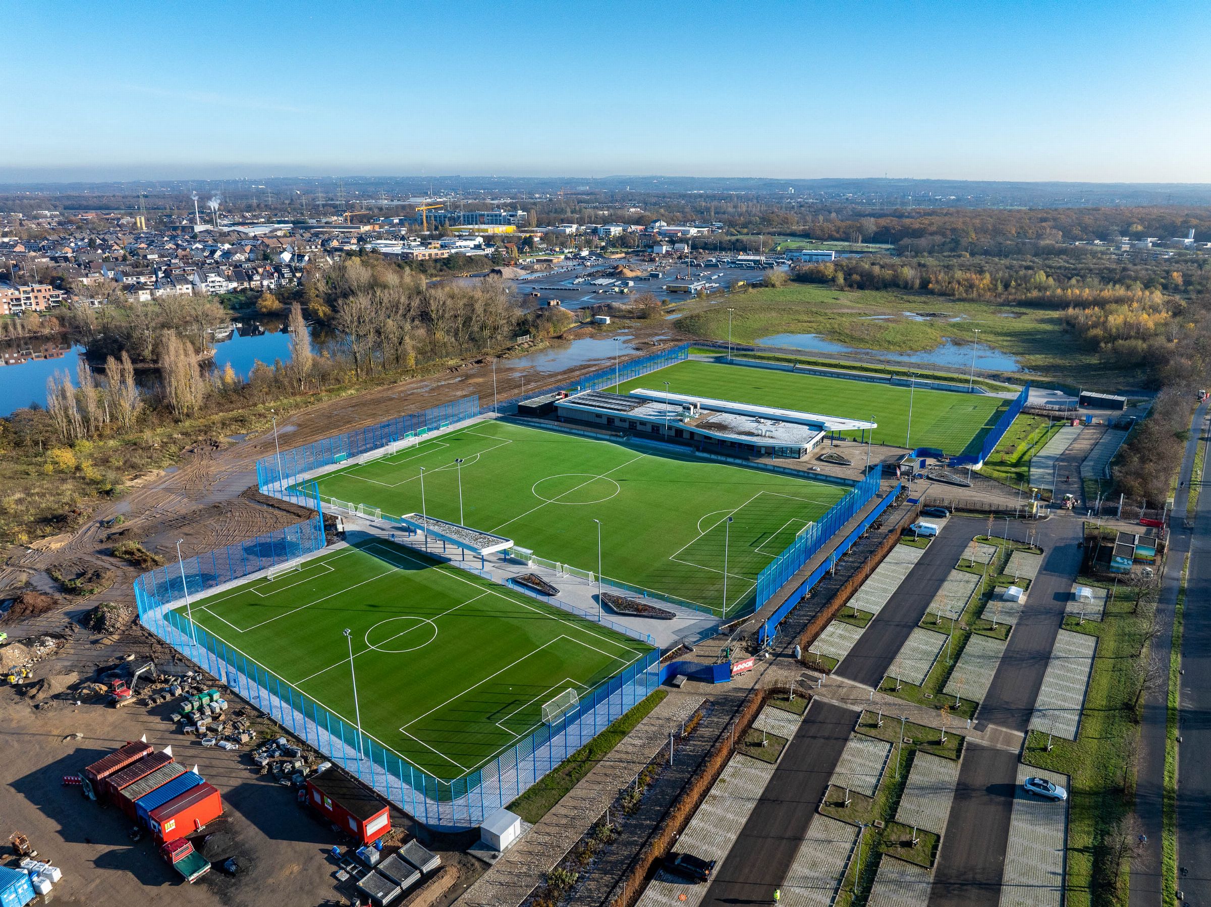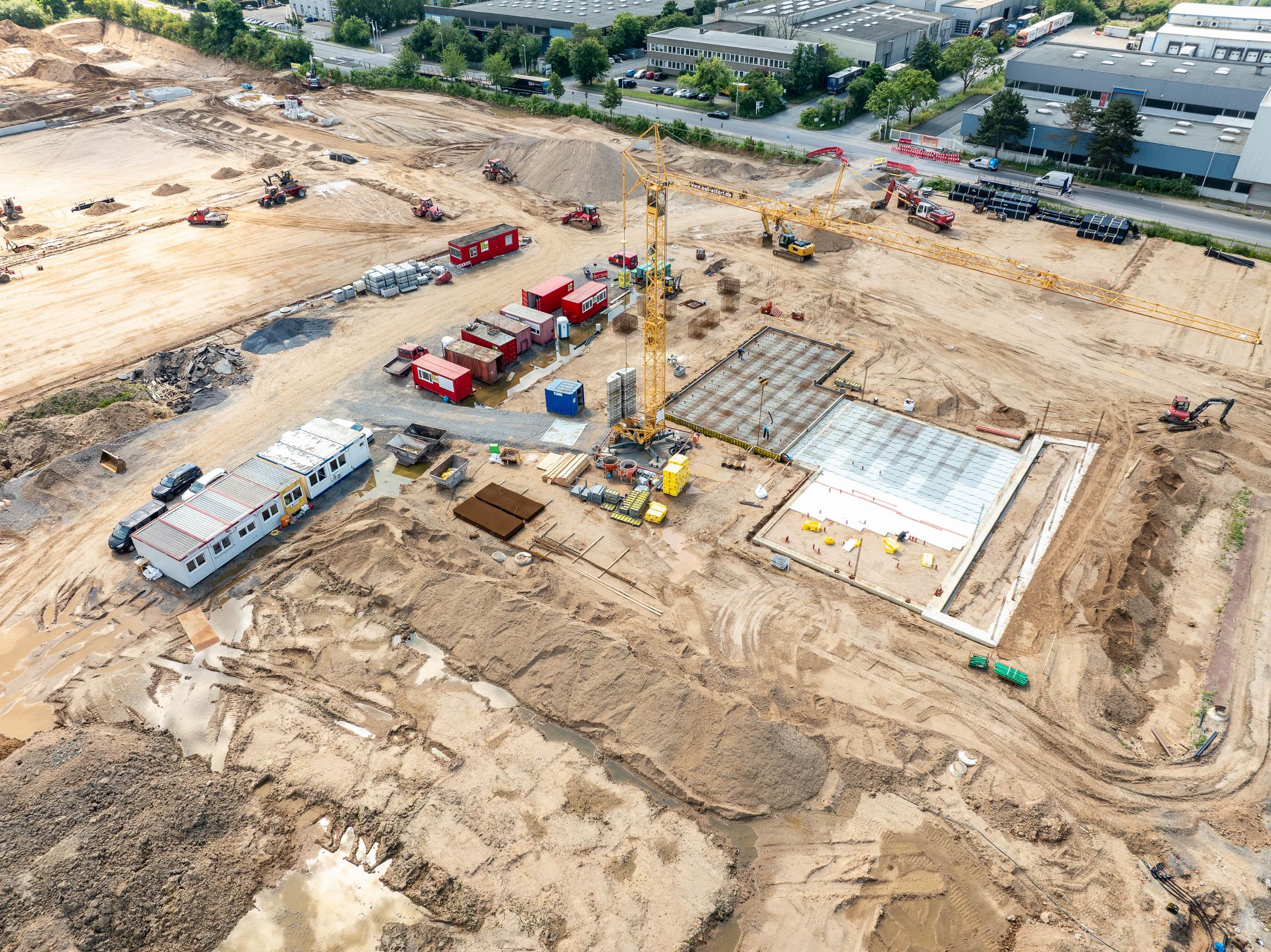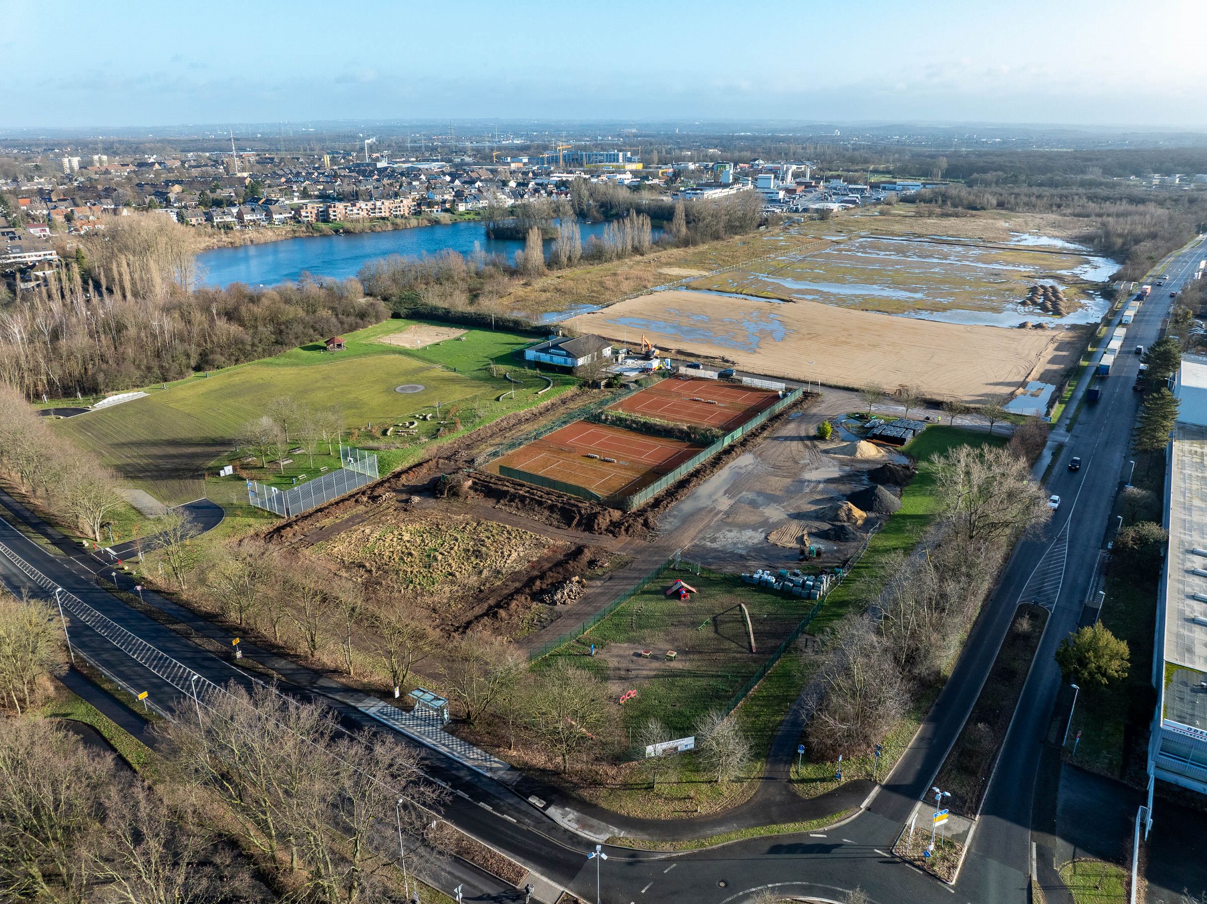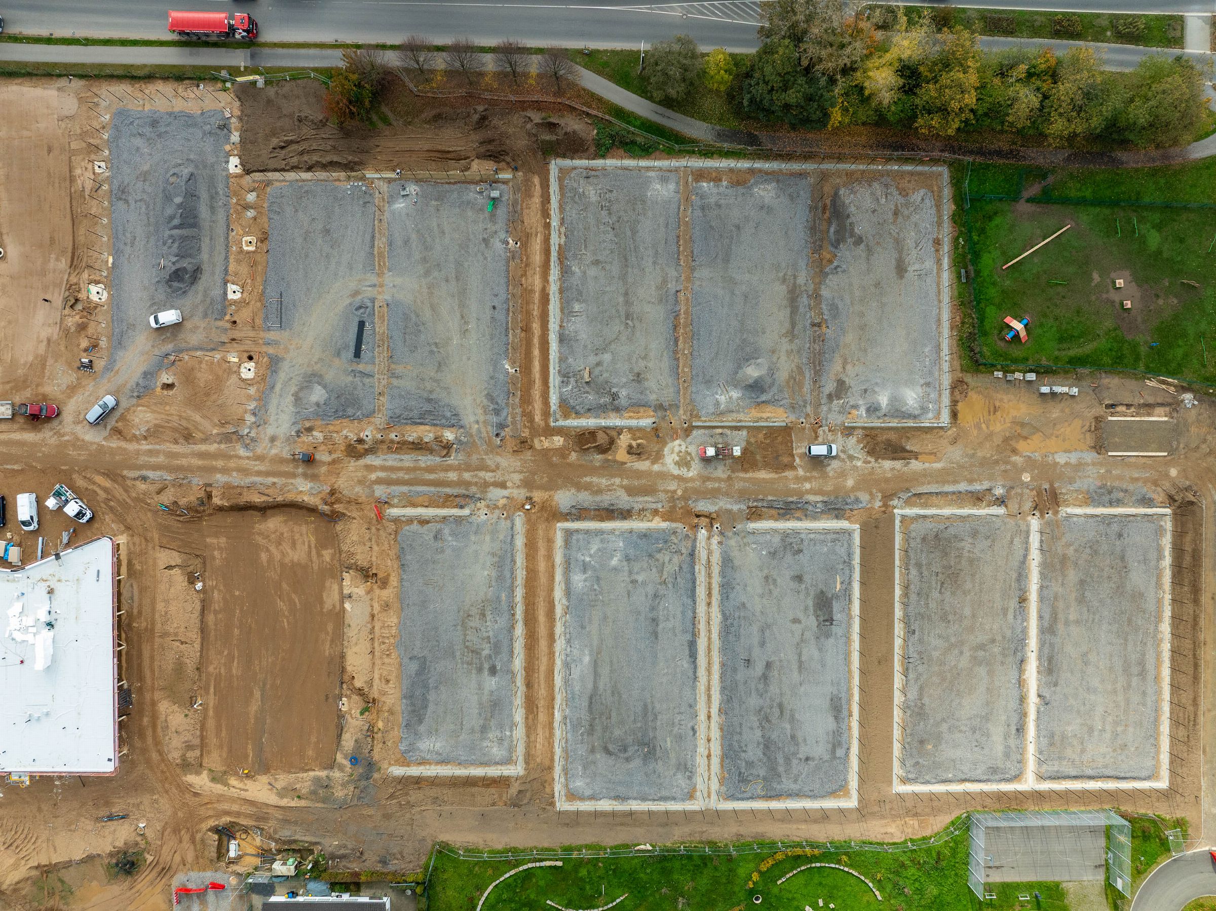 Monatliche Baudokumentation mit der Drohne für den Neubau einer großen Sportfläche für Tennis- und Fußballfelder.