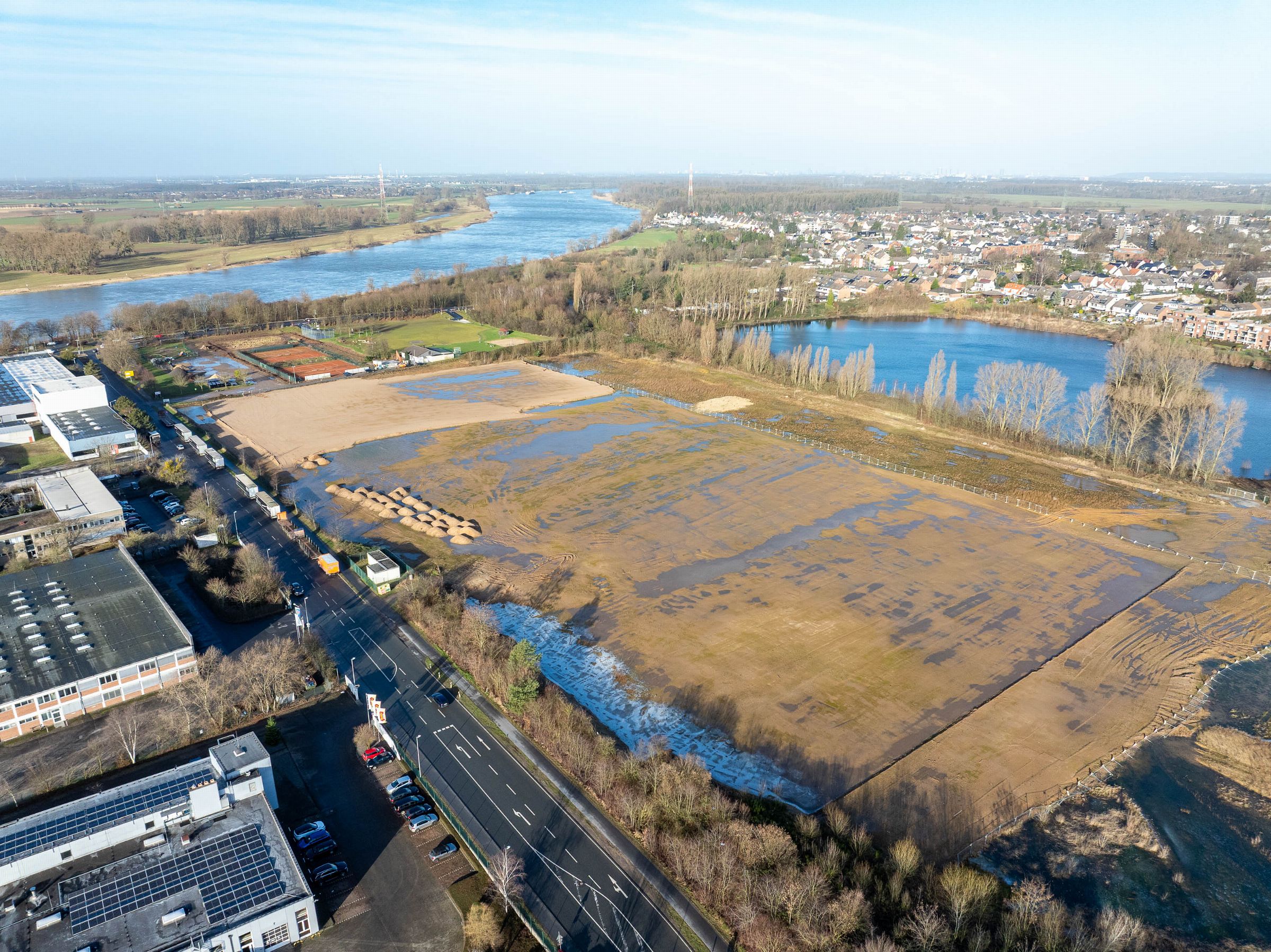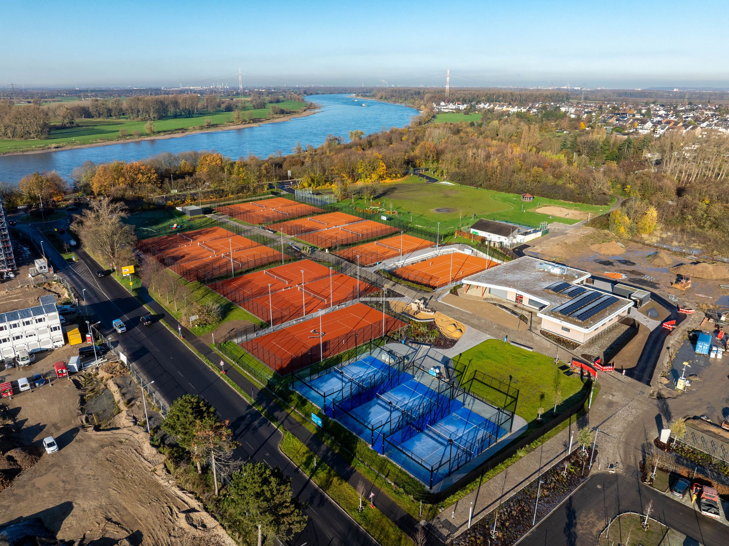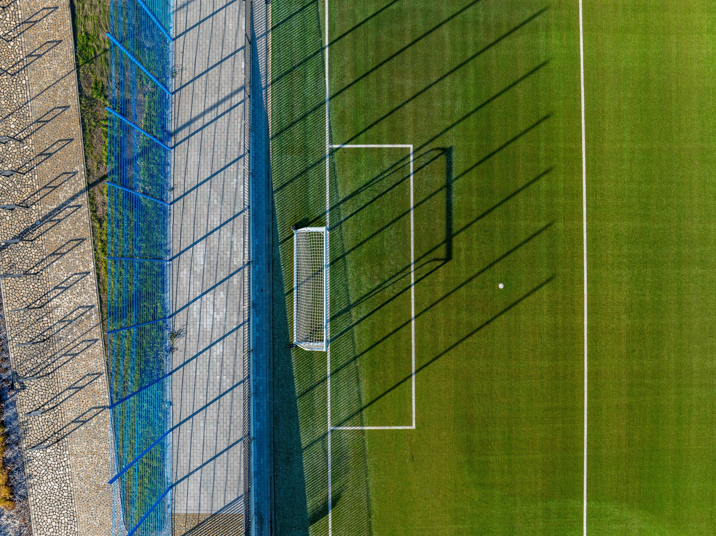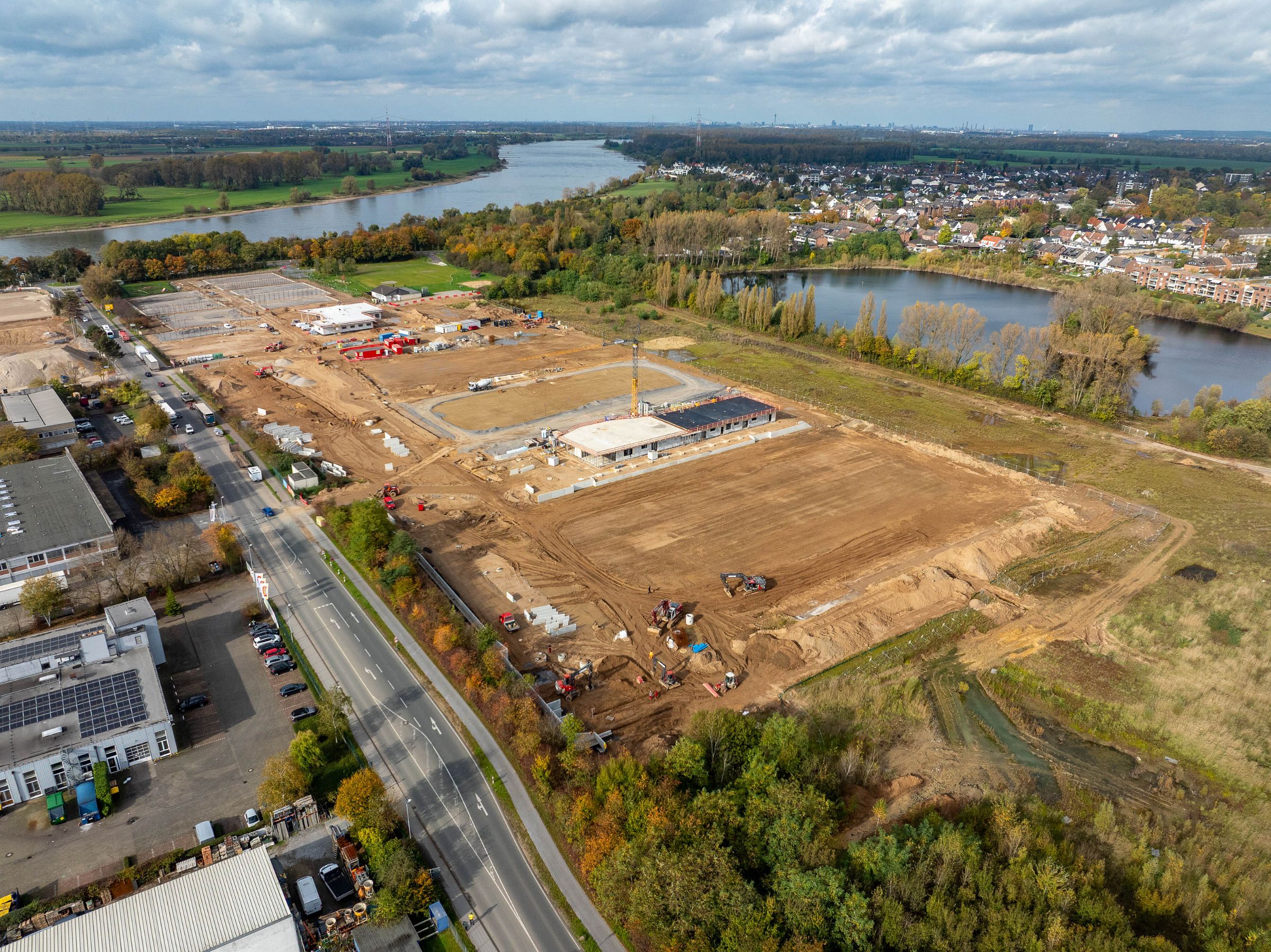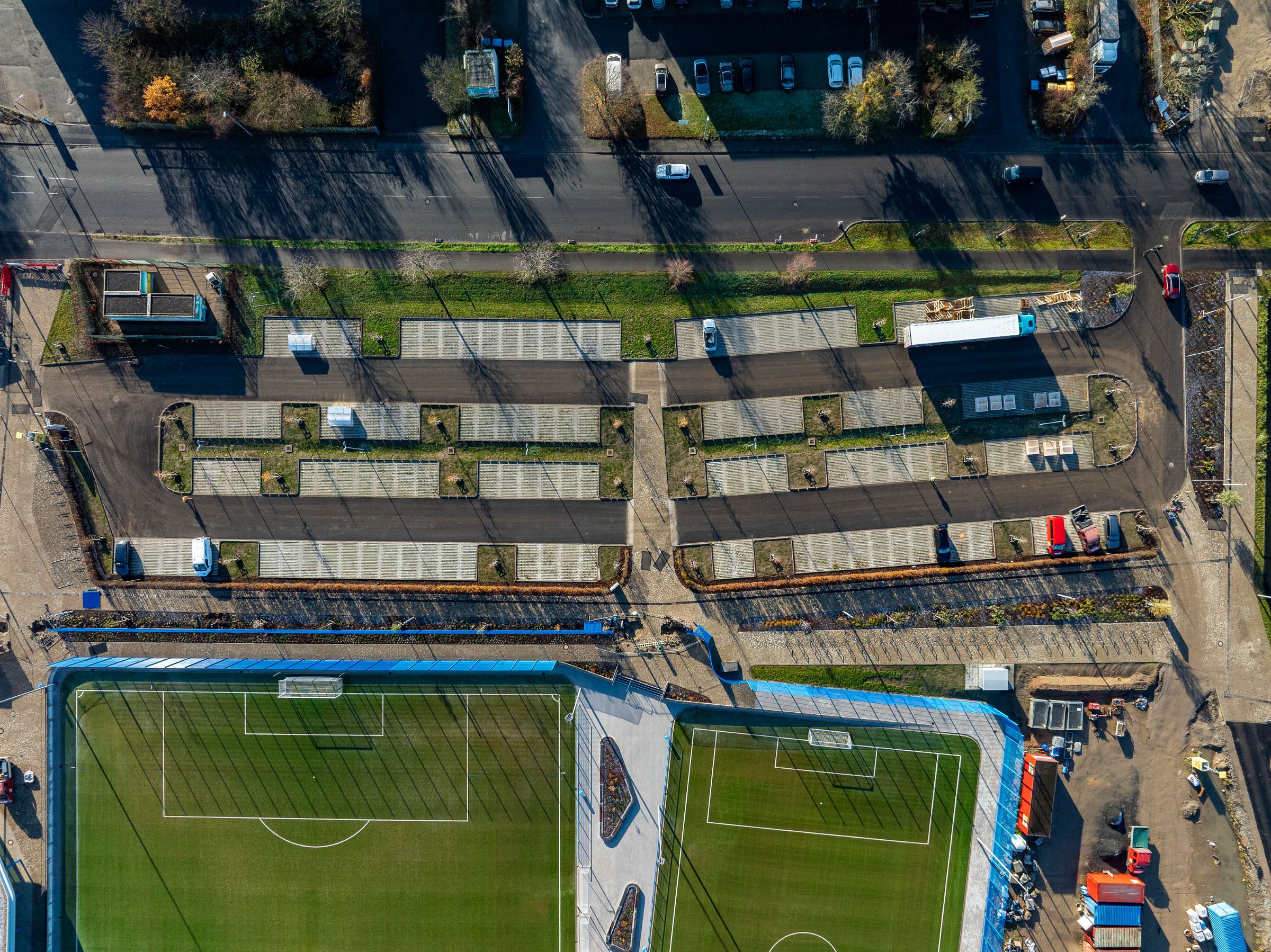 Monatliche Baudokumentation mit der Drohne für den Neubau einer großen Sportfläche für Tennis- und Fußballfelder.
