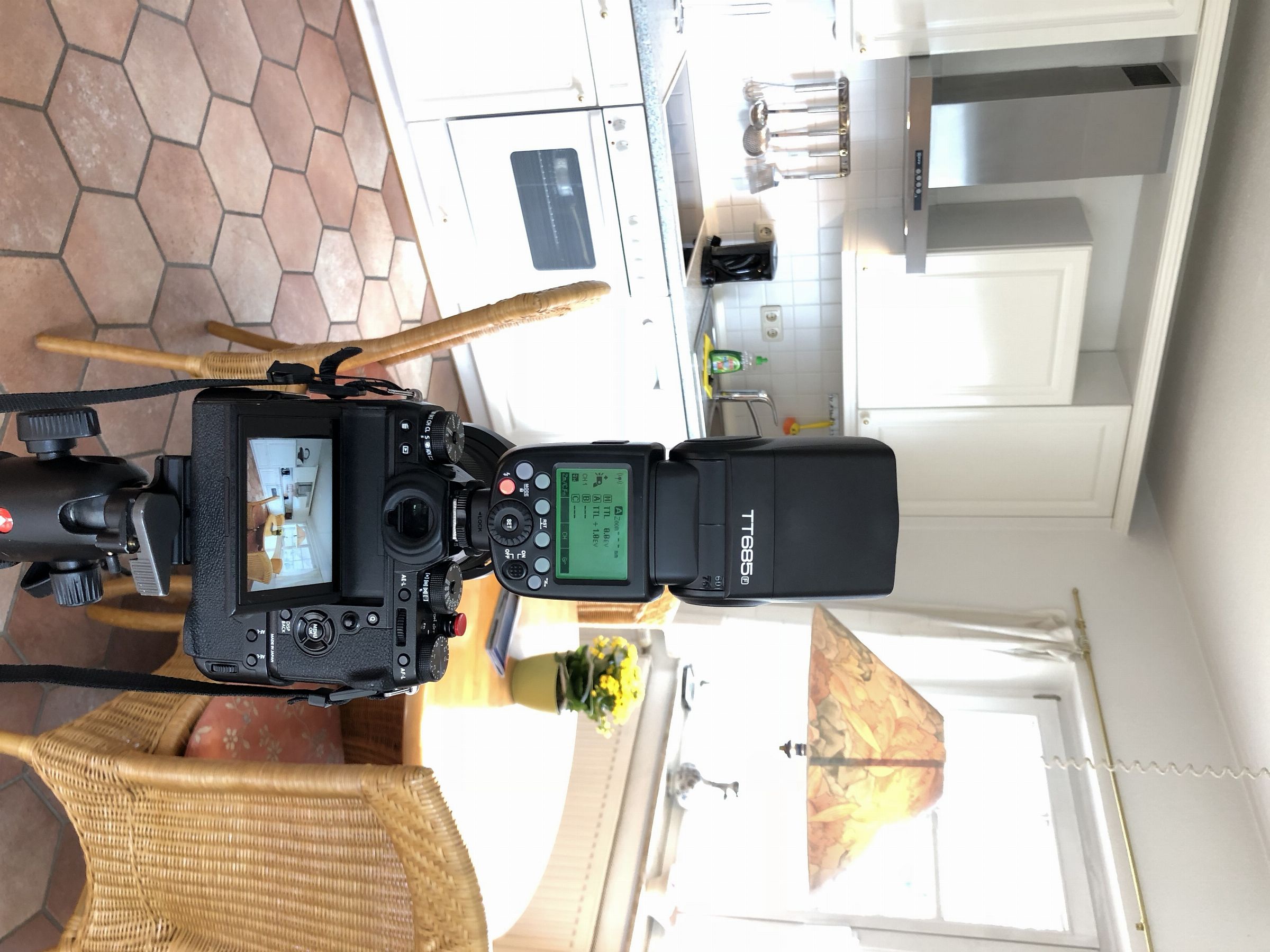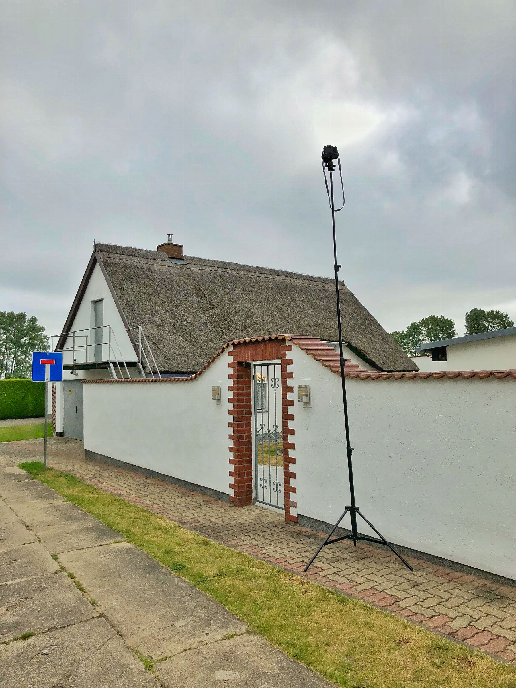 Unterwegs bin ich immer mit kleinem Besteck. Das heisst, es wird nicht mit großer Blitzanlage gearbeitet oder aufwändige Lichtsetups gebaut. Die Bilder in den Häusern werden teilweise mit Belichtungsreihen auf Stativ fotografiert, oder mit zwei, drei kleinen Systemblitzen, die per Funk und TTL Belichtungskorrektur arbeiten. Um für die Außenbilder eine schönere Perspektive zu bekommen, schraube ich die Kamera mittlerweile immer öfter auf ein großes Lampenstativ und steuere die Kamera über die WLAN Funktion mit dem Smartphone. Anbei gibt es eine schönes Vergleichsbild aus der normalen Perspektive und von dem 4 Meter Stativ.